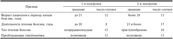 Таблица 2. Выделенные для целей клинико-анатомического анализа подгруппы случаев шизофрении