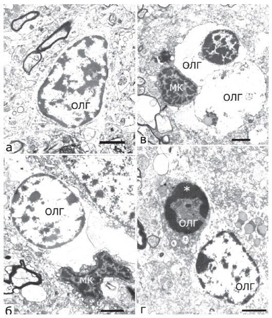 Рисунок 1. Ультраструктура олигодендроглиоцитов (ОЛГ) в пирамидном слое СА3 области гиппокампа из мозга контрольных случаев (а) и случаев шизофрении (б — г). Набухание цитоплазмы и органелл в ОЛГ, контактирующем микроглиальной клеткой (МК), шизофрения (б). Дегенерация ОЛГ при шизофрении: (в) некроз и (г) апоптоз (звездочка).