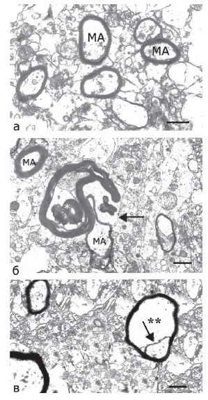 Рисунок 2. Ультраструктура миелинизированных аксонов (МА) в пирамидном слое СА3 области гиппокампа из мозга контрольных случаев (а) и случаев шизофрении (б — в).